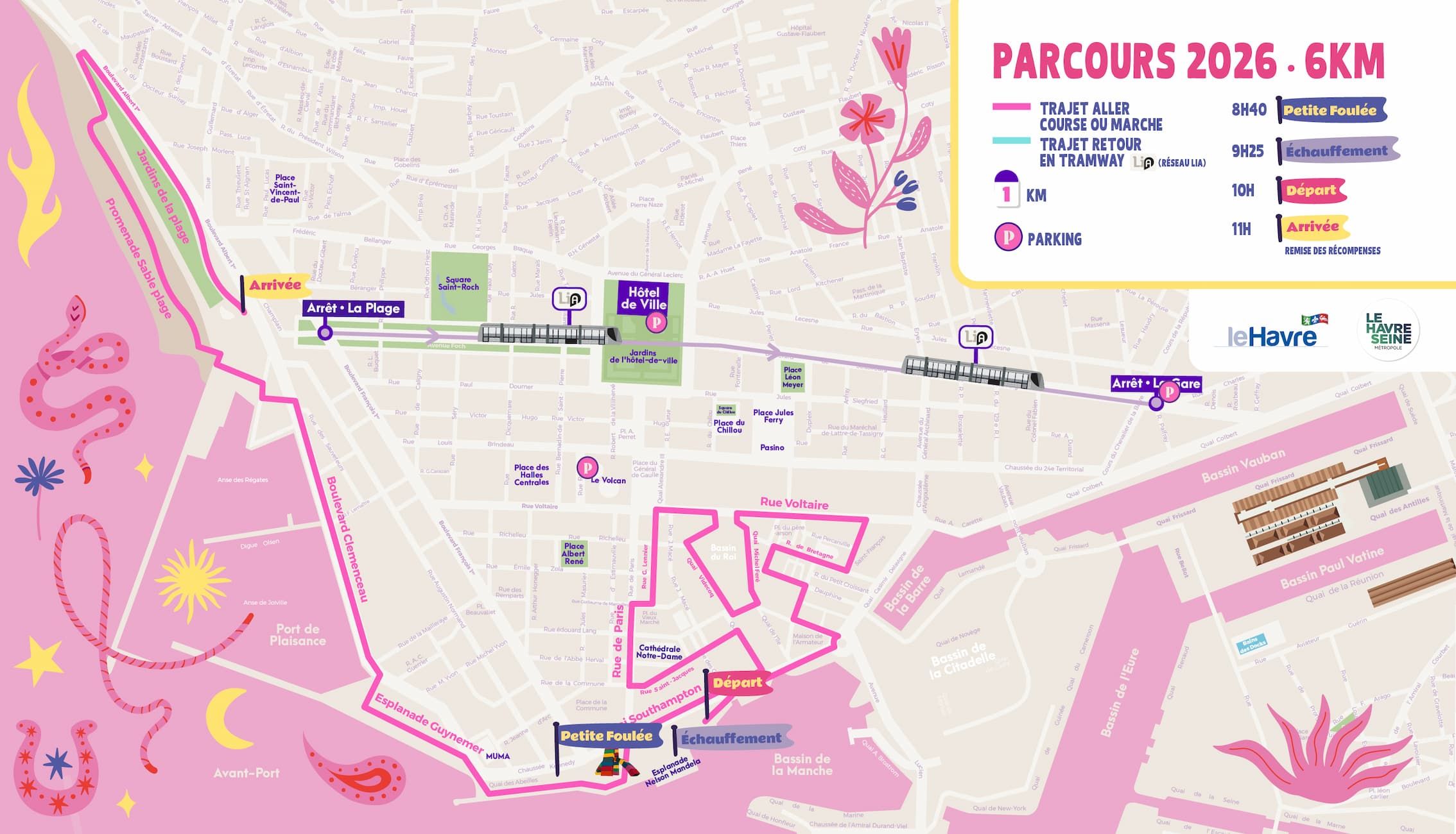 Depuis 2024, le village départ est concentré sur l’esplanade Nelson Mandela au pied de la Catène. Sur ce grand espace, nous sommes toutes et tous réunis pour La Petite Foulée de 8h30 à 9h45, le pot d’accueil à partir de 8h30, et bien sûr le grand échauffement collectif avec Accrosport avant de vous élancer toutes en rose dans les rues du Havre !